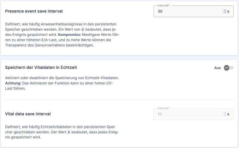 In dieser Version werden zusätzliche Parameter eingeführt, um den Speicher-Intervall von Präsenz-Events und Echtzeit-Vitaldaten festzulegen. Diese Intervalle werden pro Sensor im Gefahrenbereich eingestellt.